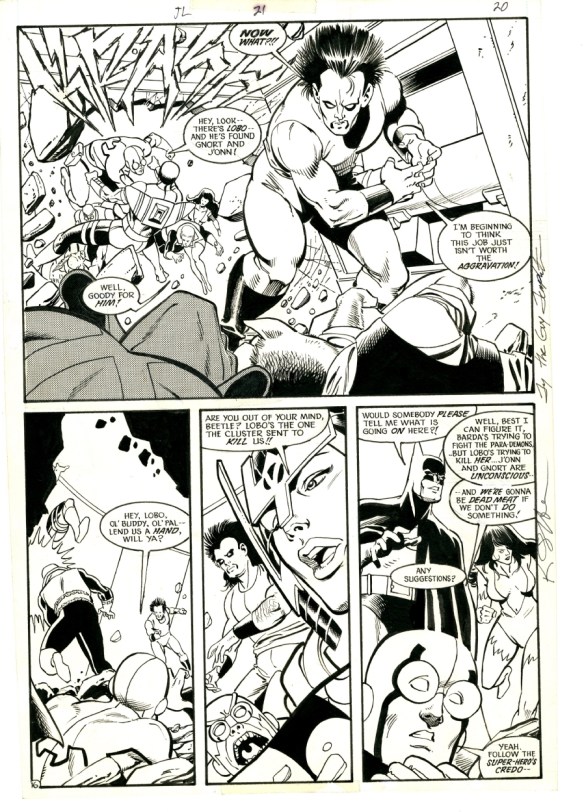 Daí surgiu a ideia de fazer uma Liga diferente, com pegadas de humor pastelão, do tipo que você está vendo hoje nos filmes dos Guardiões. Em meio a tantas histórias memoráveis (e impagáveis) recomendo o arco em que a Liga vai parar em Apokolipse para resgatar o Senhor Milagre que havia sido sequestrado a mando da Vovó Bondade, assecla de Darkseid. Nem preciso dizer que os heróis se metem em confusões inacreditáveis (O Caçador de Marte, a Grande Barda e o Gnort juntos em uma nave é demais!). Sem contar que o Lobo ainda está tentando assassinar o grupo. O arco começa mesmo por volta da edição 17, mas pega fogo nos números 21 e 22 (formatinhos da Abril).
