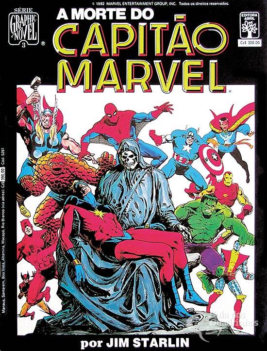 E por falar em Jim Starlin, outra obra que deu vontade de reler após o filme foi a Graphic Novel 03: A Morte do Capitão Marvel. A HQ narra, claro, os últimos momentos de vida do guerreiro kree e vemos um desfile de personagens cósmicos da Marvel, incluindo Thanos e a própria Morte. Sem contar vários dos super-heróis que também aparecem para prestar sua homenagem ao colega.