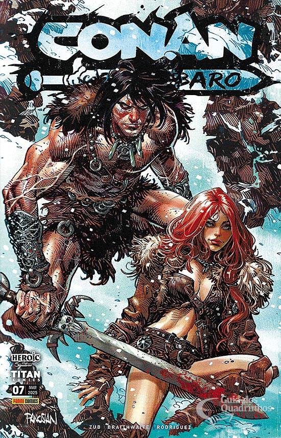 Já a edição 07, traz essa capa não tão legal! A arte da quarta capa é bem mais bacana, mas acredito que não foi escolhida por ser mais “conceitual” e não tão “vendável”. A história também não é lá essas coisas. Mostra fatos do passado de mocidade do Conan que, até certo ponto, não dá para entender muito para onde que levar a trama. Claro que a quarta capa já dá uma pista, mas da segunda parte em diante, vemos que se trata de (mais uma) adaptação do conto “A Filha do Gigante do Gelo”. Dessa vez, mostrando fatos “nunca antes mostrados” da história. Sinceramente? Não sei se é pelo fato de eu já ter lido e relido as adaptações anteriores ou se é pelos desenhos mais “durões” e inexpressivos (depois de ler um Rob de La Torre, quase todo desenho fica durão e inexpressivo), mas a trama não me pegou tanto.