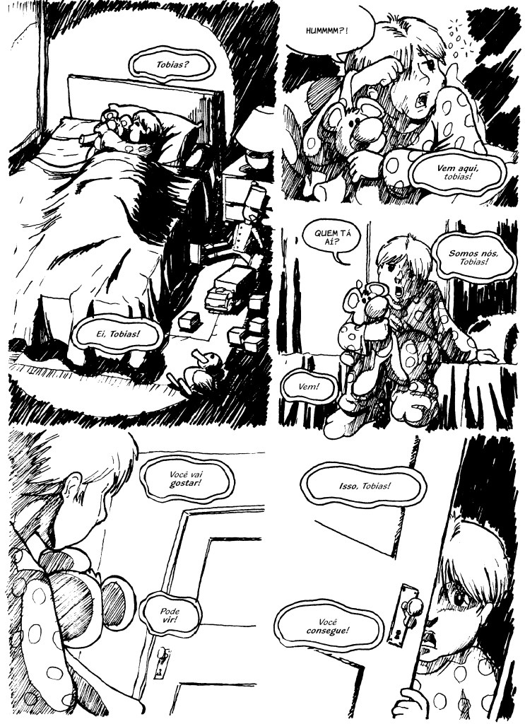 PASSO 02: A ARTE-FINAL – Aqui, não tem mistério! É nanquim no papel! Ou na tela! Como eu queria um traçado forte e, por vezes, interrompido, utilizei os “pincéis redondos com tamanhos variados”. Fui mudando o pincél de acordo com a área que estava finalizando, pontas maiores para o primeiro plano e pontas menores para os planos mais afastados. E a mudança de pressão da mão sobre a caneta óptica também influencia na variação dos traçados.
